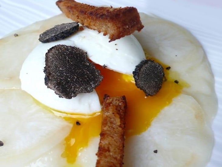 Œuf mollet, cerfeuil tubéreux et lames de truffes