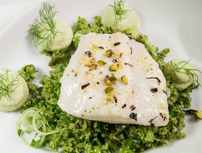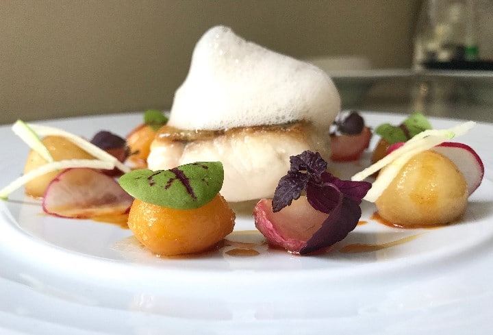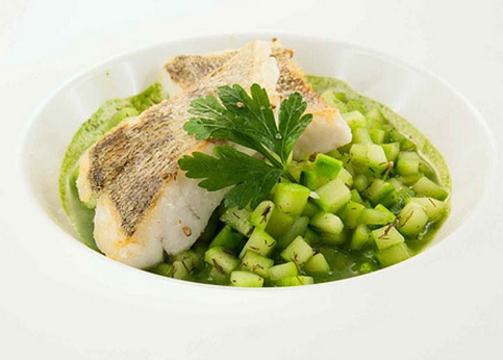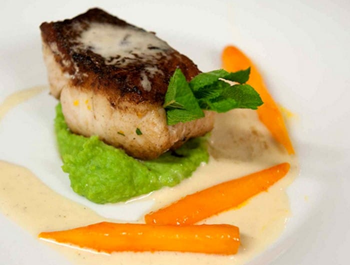 Sandre meunière au beurre blanc, mousseline de petits-pois et jeunes carottes