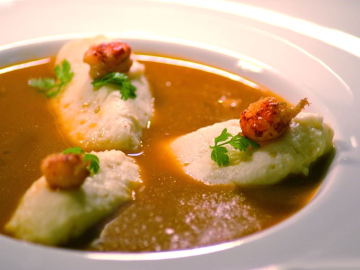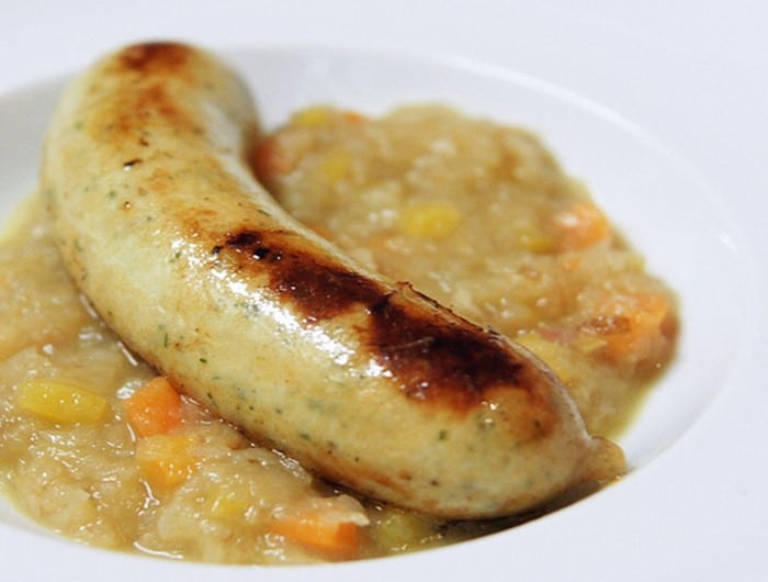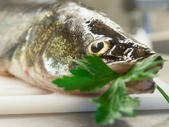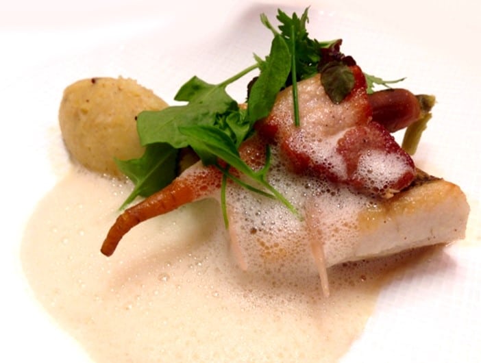 Pavé de sandre au lard, jus de choucroute et pomme de terre écrasée au genièvre