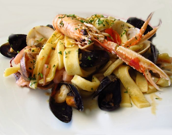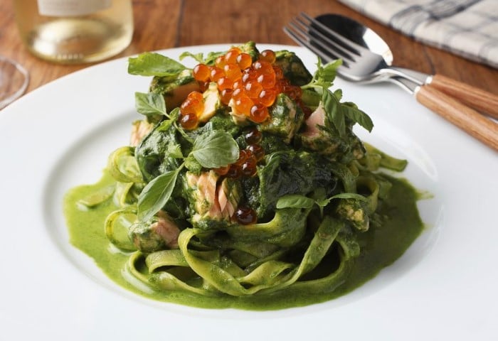 Tagliatelles à l’épinard, saumon et œufs de saumon