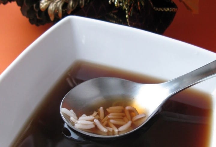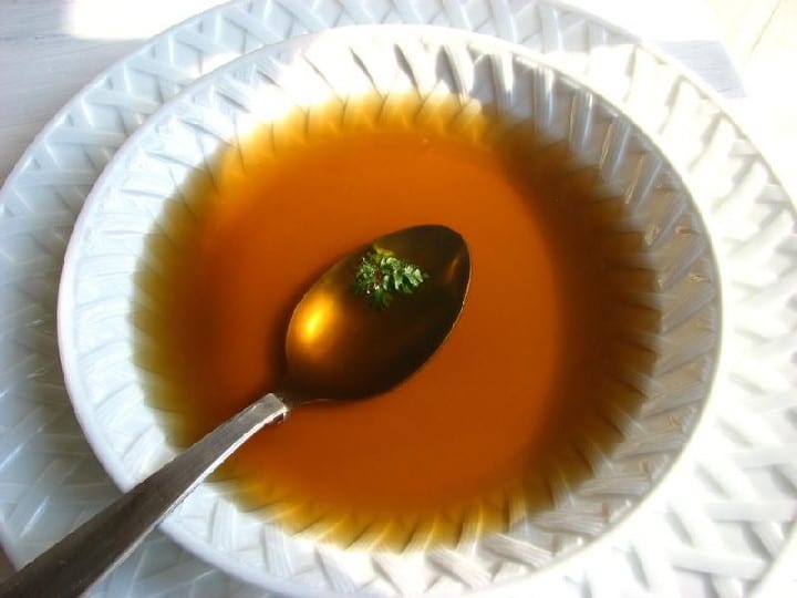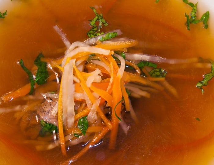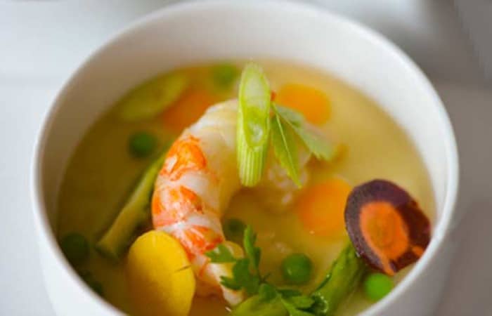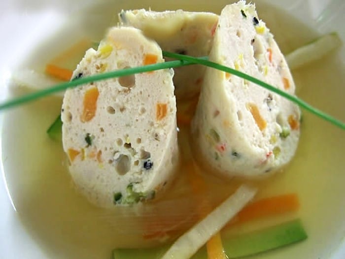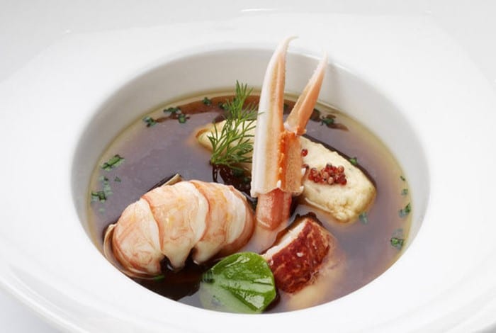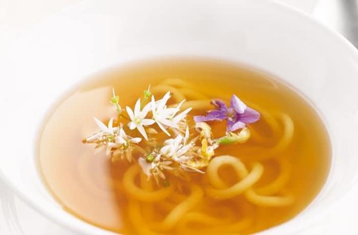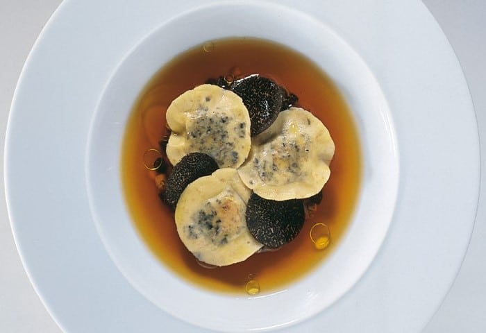Consommé de volaille ravioles de foie gras et lames de truffe