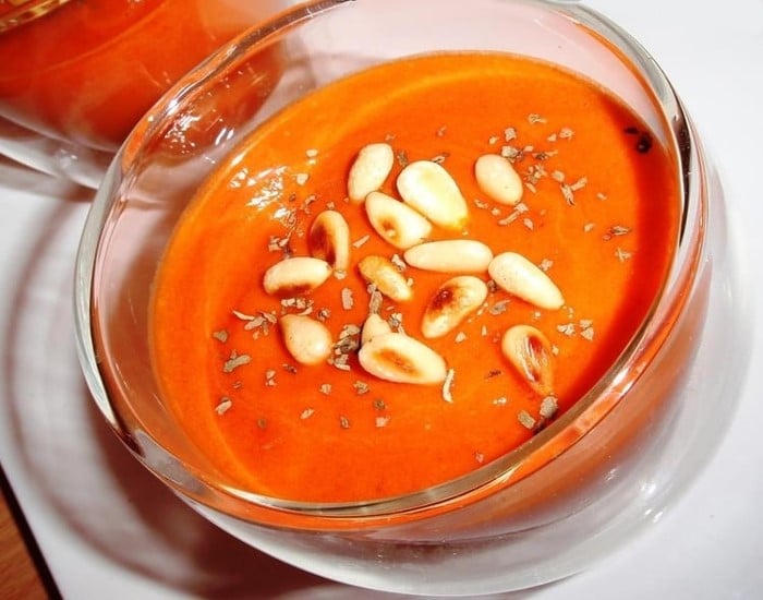 Velouté de poivron rouge aux pignons grillés