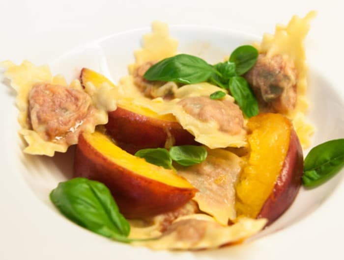 Raviolis farcis à la tomate, pêche jaune et basilic