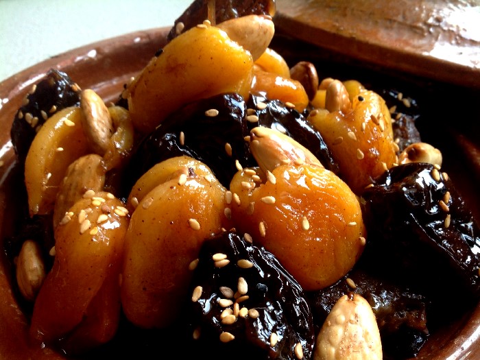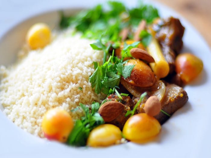 Tajine d’agneau aux mirabelles et amandes, semoule de couscous