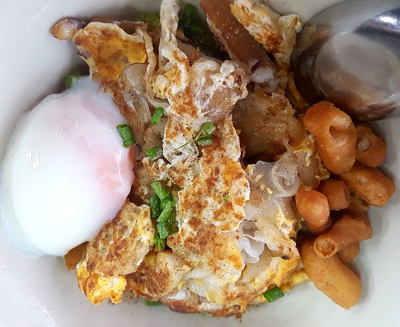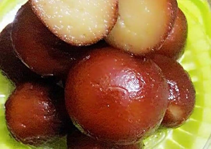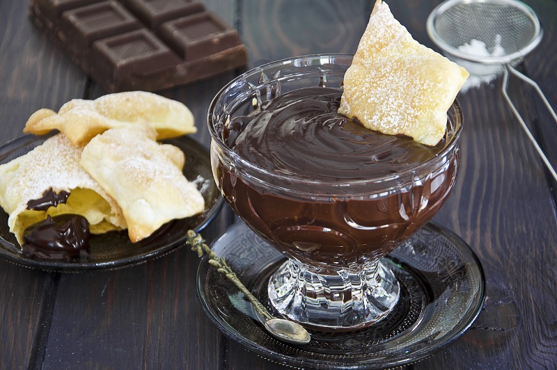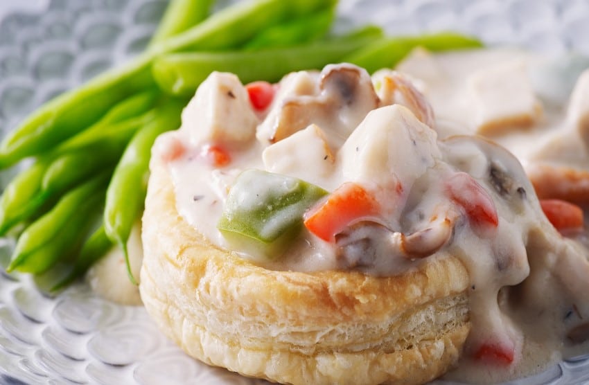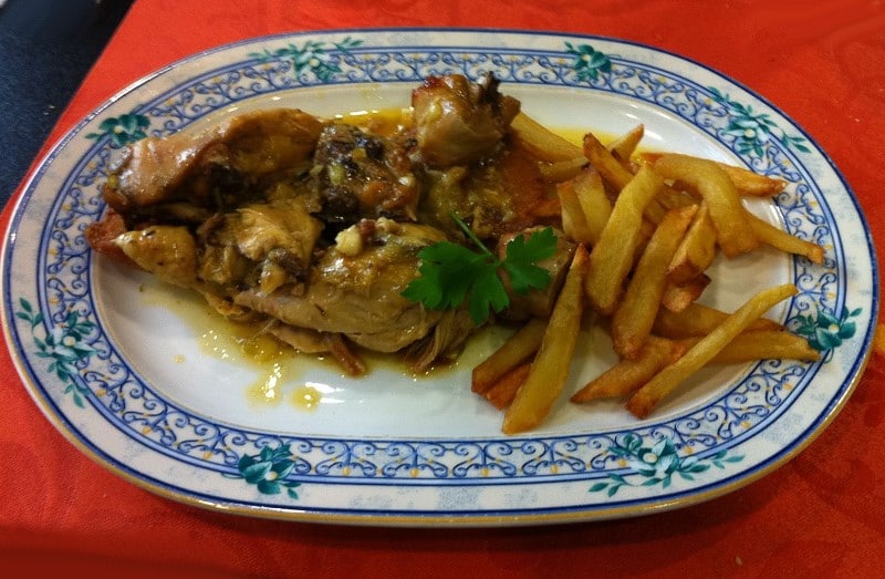Poulet en pepitoria, avec des croûtes de pain frit et des pommes frites