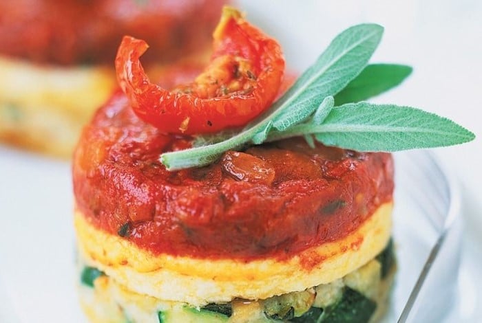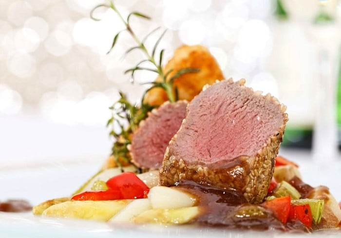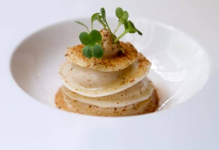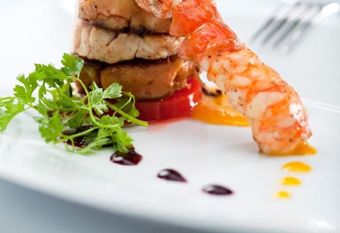 Millefeuille de foie gras d’oie, ris de veau et langoustine