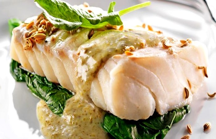 Pavé de lieu jaune aux épinards et crème de riz aux algues