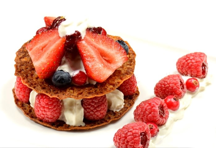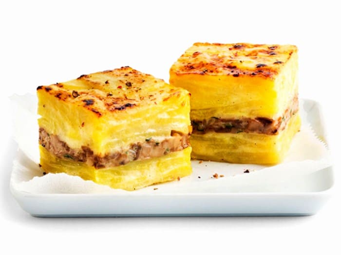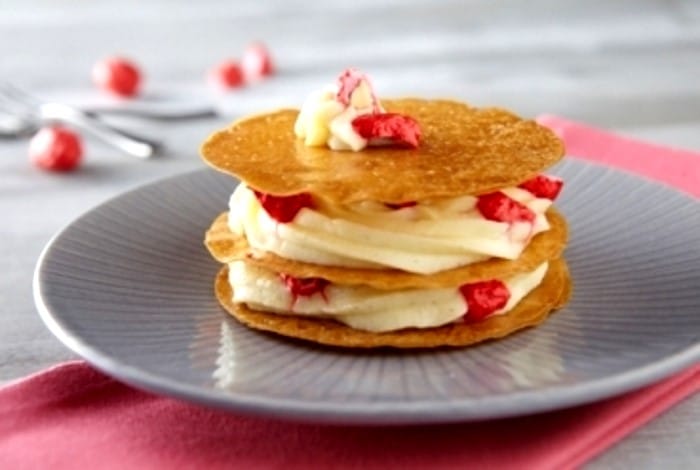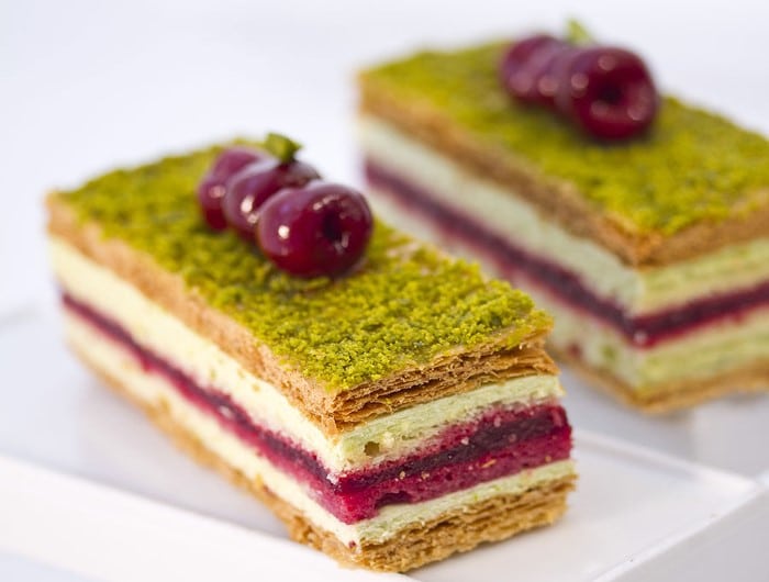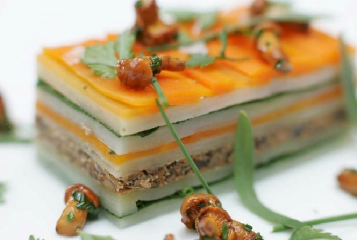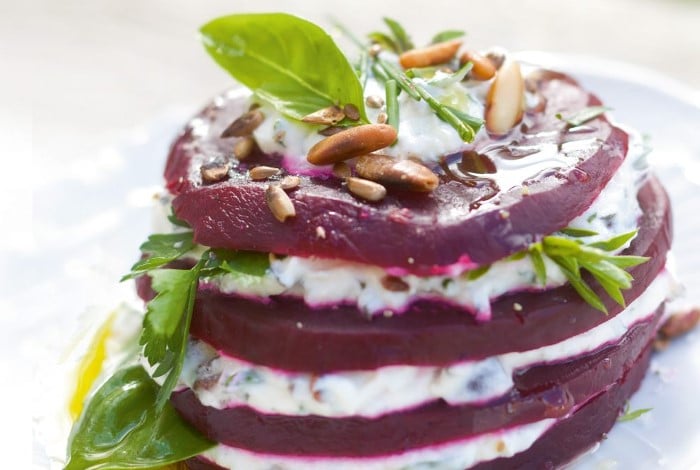 Millefeuille de betterave rouge au chèvre et pignons dorés