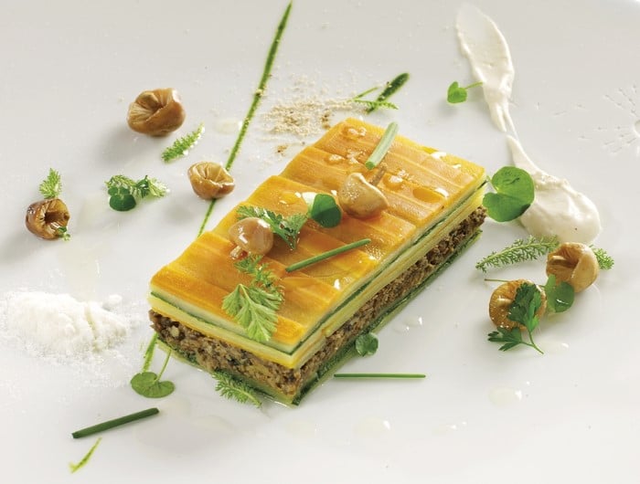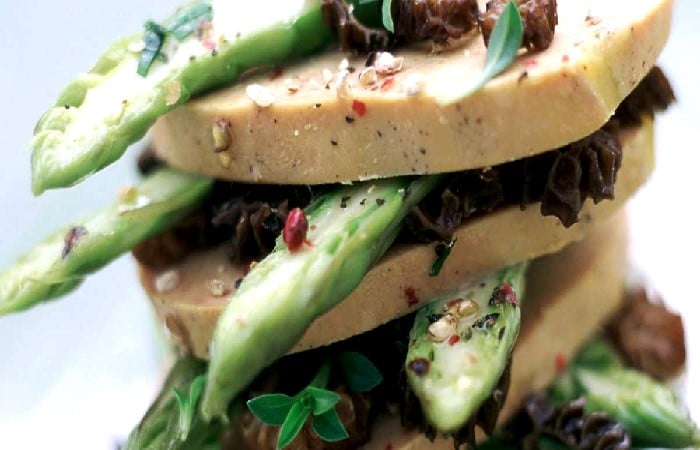 Millefeuille de foie gras aux asperges vertes et aux morilles