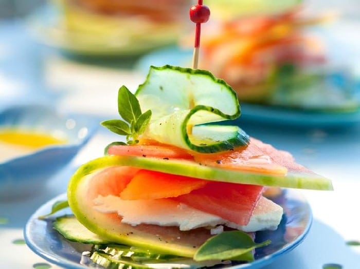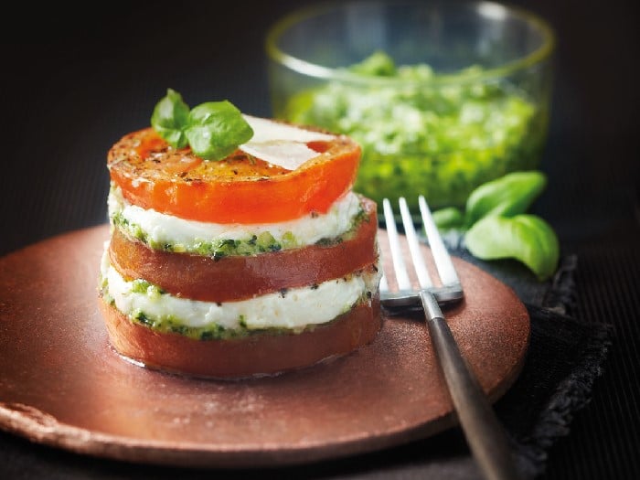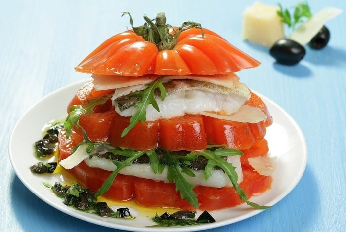 Millefeuille de tomate cœur de bœuf au cabillaud de Norvège