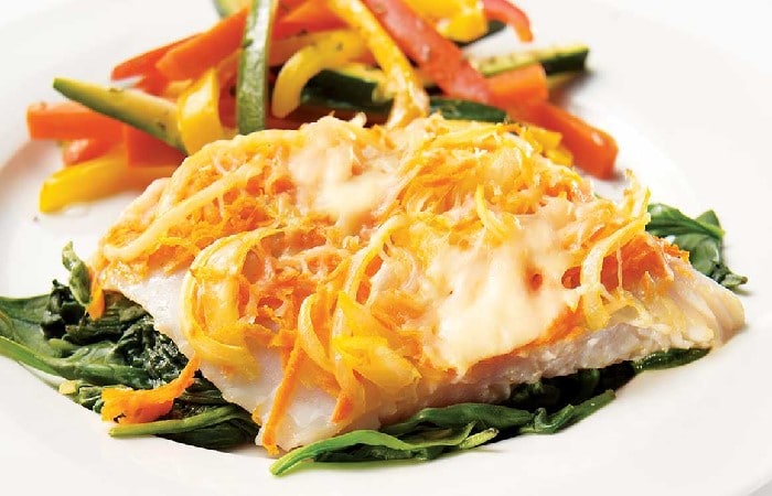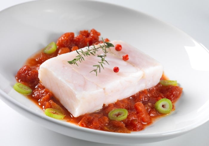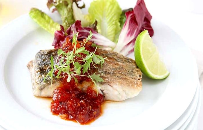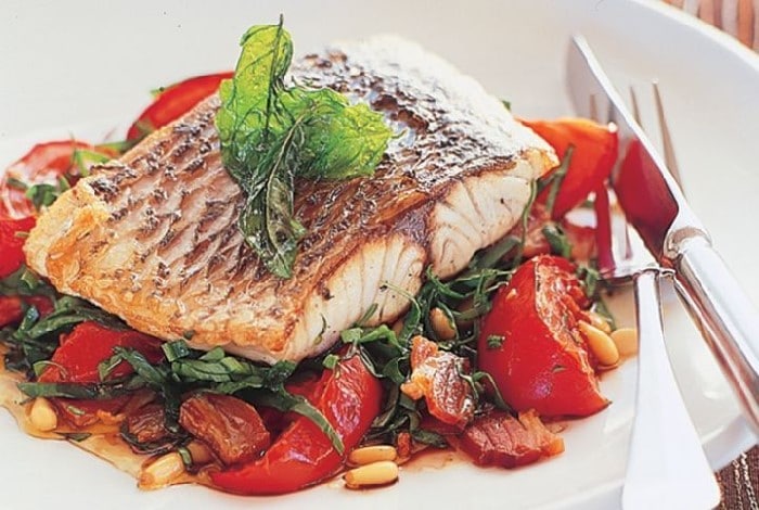 Dos de barramundi aux tomates, pignons et effeuillée d’épinards