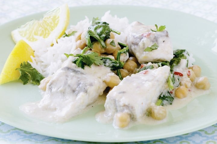 Filets de barramundi à la crème de coco, riz et pois chiches