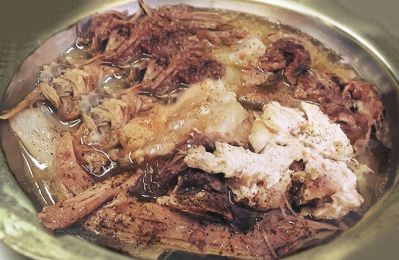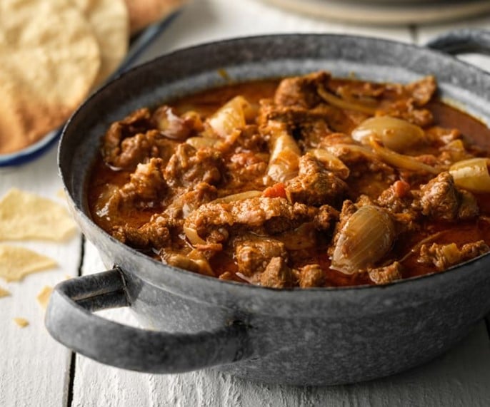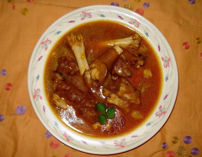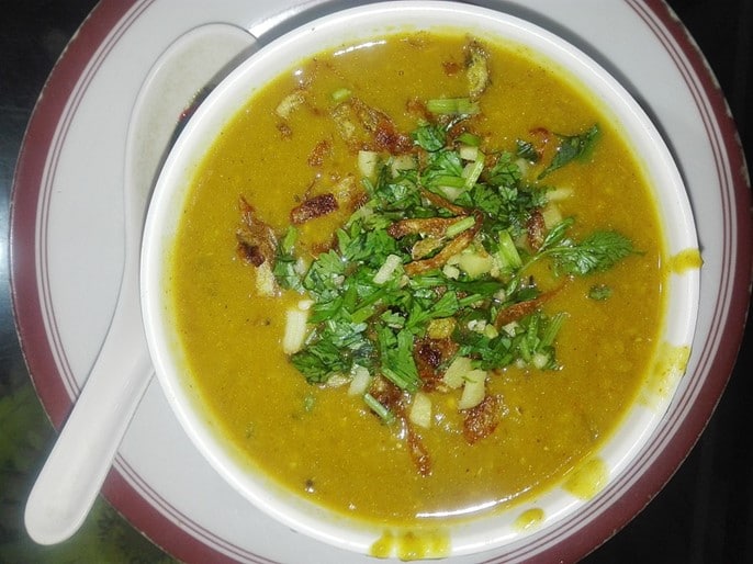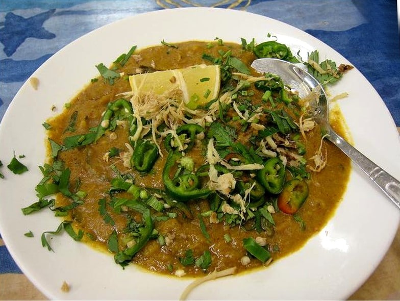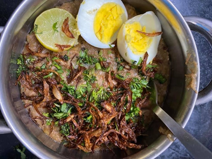 Haleem de mouton avec œuf, citron vert et oignons frits
