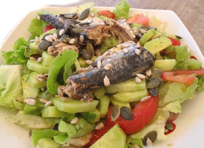 Salade de sardines à l’avocat, tomates, concombre et pignons