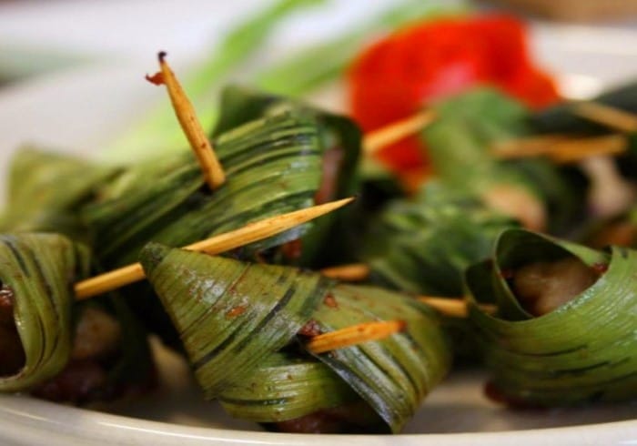 Brochettes de poulet cuites en feuilles de bananier