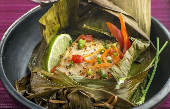 Dos de cabillaud dans sa feuille de bananier