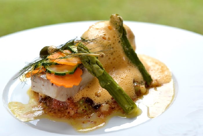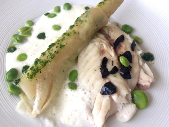 Maigre, asperges blanches et fèvettes, lait d’oignon émulsionné