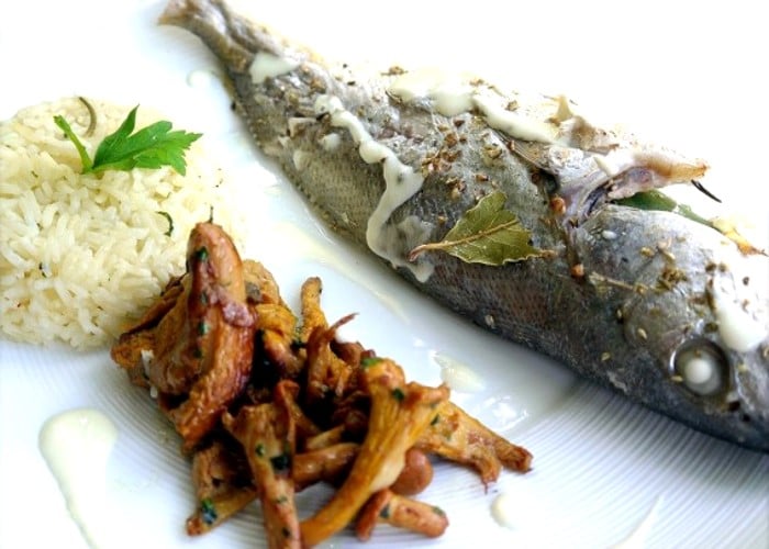 Maigre au four à la crème d’oignon et grains de fenouil, chanterelles et riz blanc