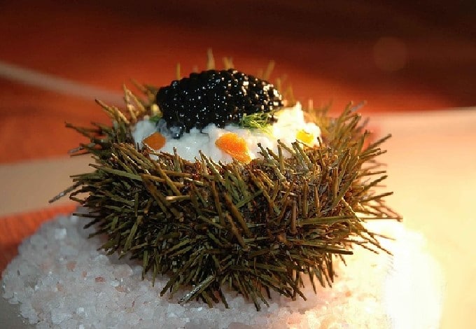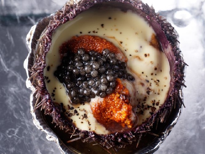 Oursin farci au crabe, brunoise de légumes et caviar