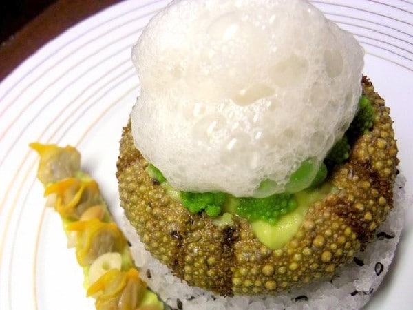 Oursin en coque, mousseline de chou romanesco et tartine croustillante