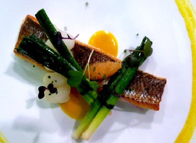 Filet de féra aux jeunes légumes, bouillon de carotte et curcuma