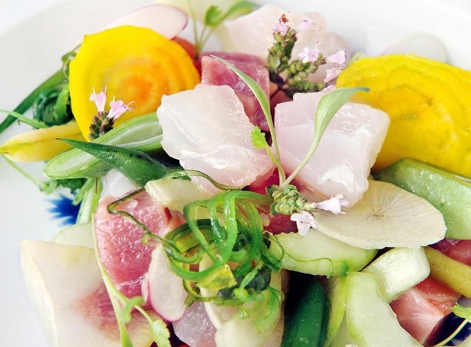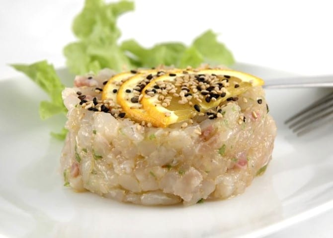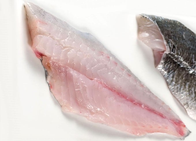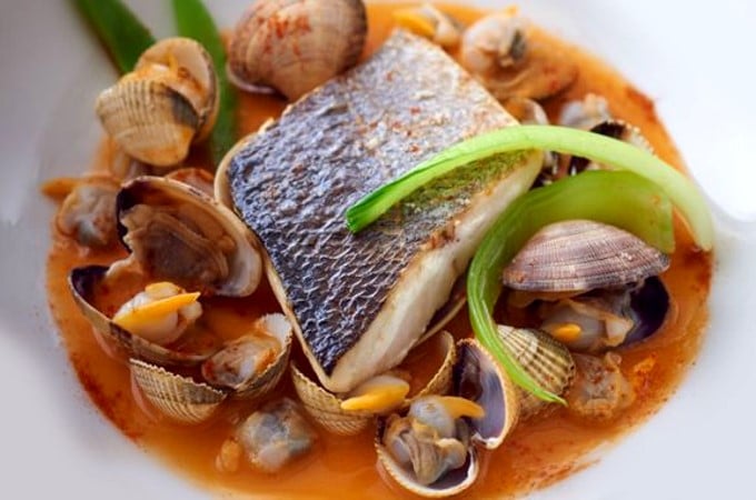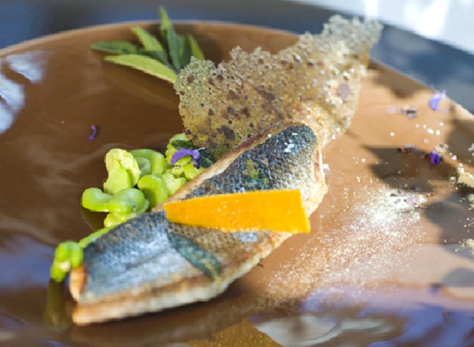 Loup de ligne à l’unilatérale, infusion à la sauge et chips à l’orange