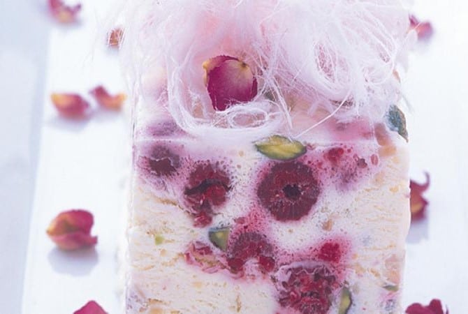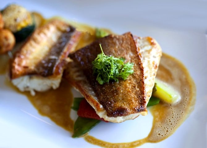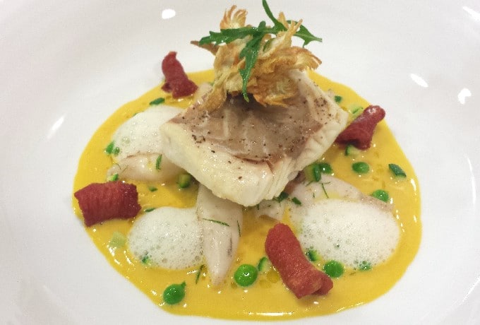 Filet de loup cuit au four, pistes juste poêlés, jus safrané et chips d’artichauts