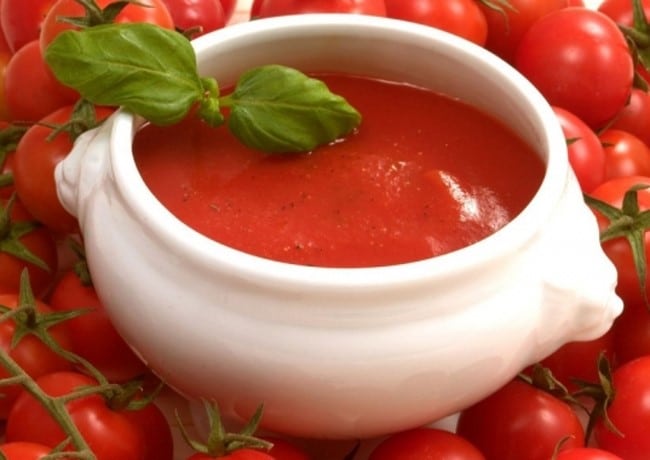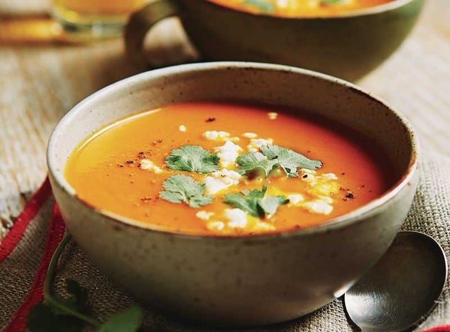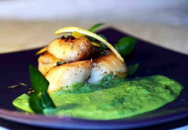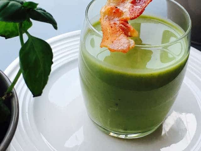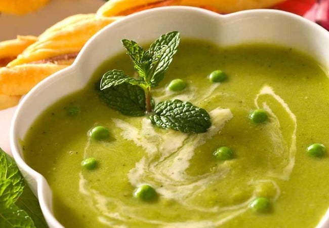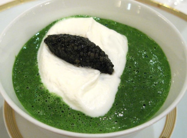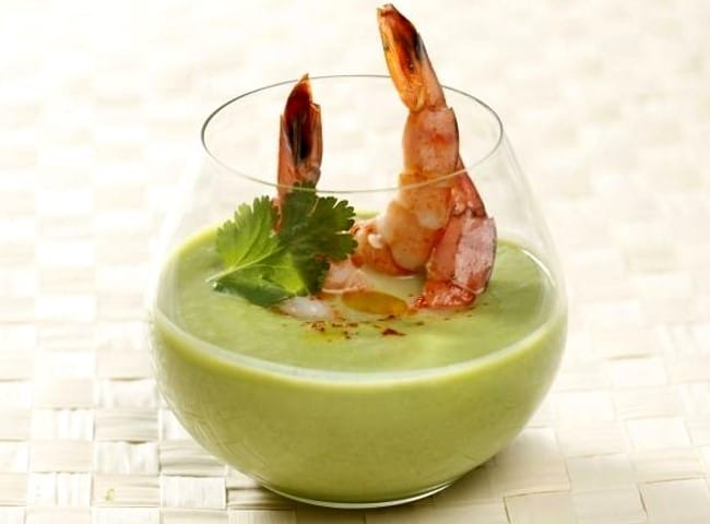 Crème de petits pois aux queues de gambas et piment d’Espelette