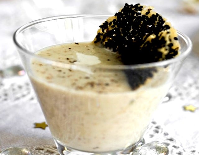 Crème d’orge perlée et tuile de parmesan aux graines de sésame noir