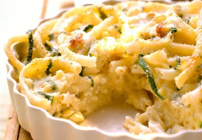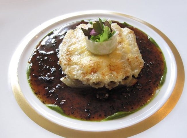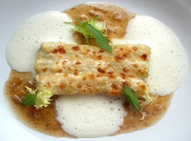 Gratin de macaronis farcis à la truffe noire, émulsion d’artichaut