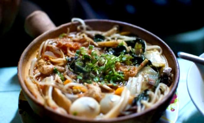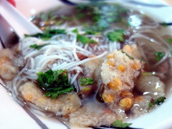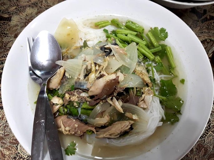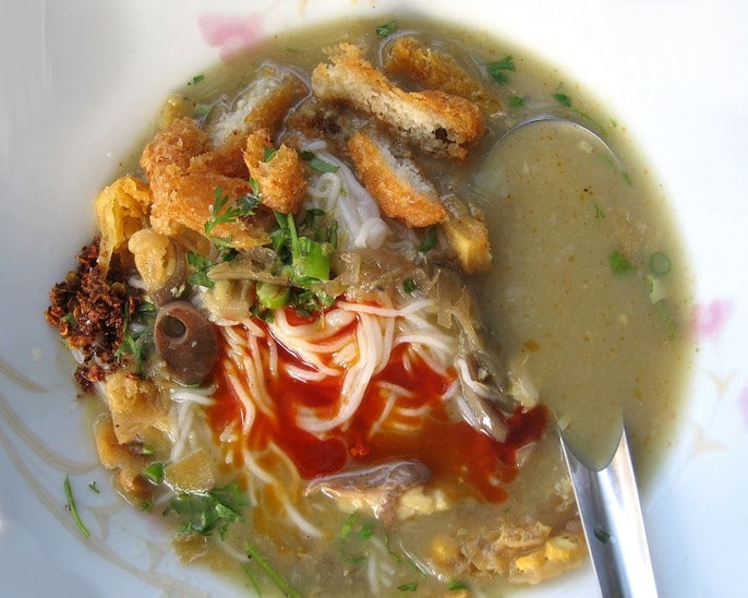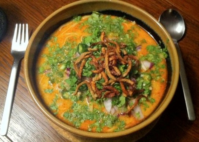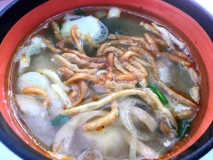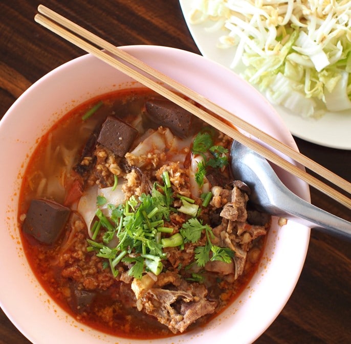 Khao soi Mae Sai avec du porc haché et des morceaux de sang caillé