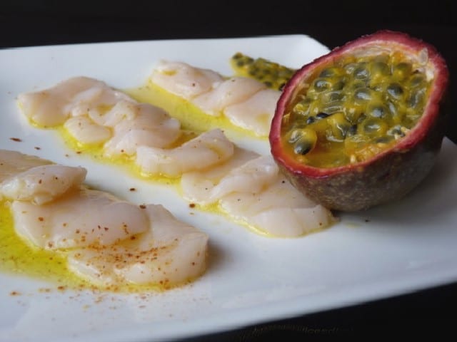 Carpaccio de Saint-Jacques à l’huile de vanille et au fruit de la passion
