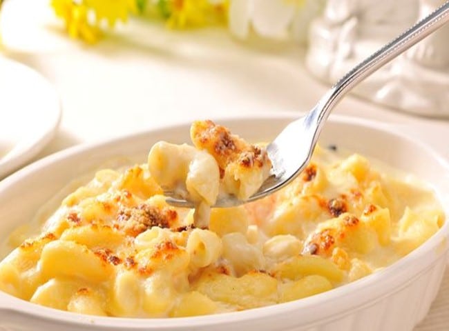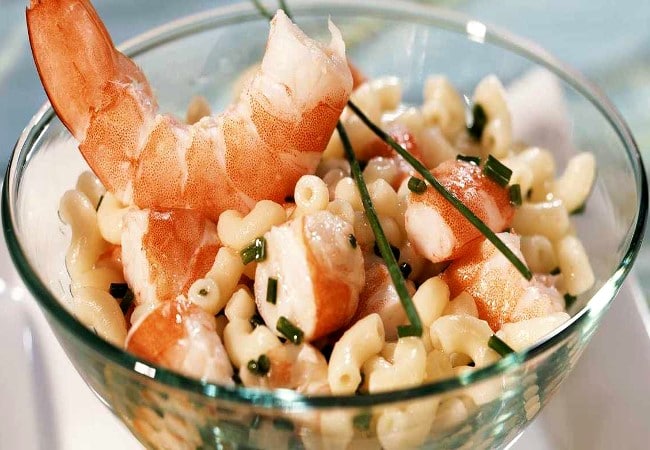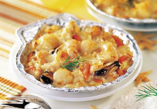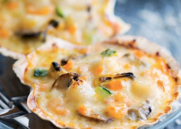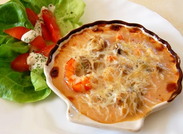 Coquille gratinée aux noix de pétoncles et crevettes, sauce de bisque