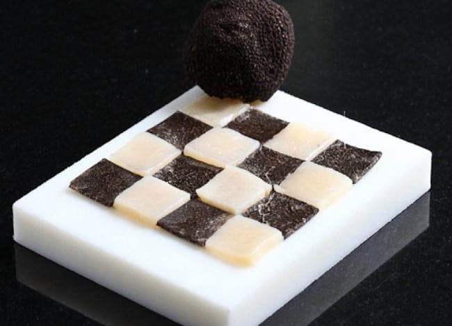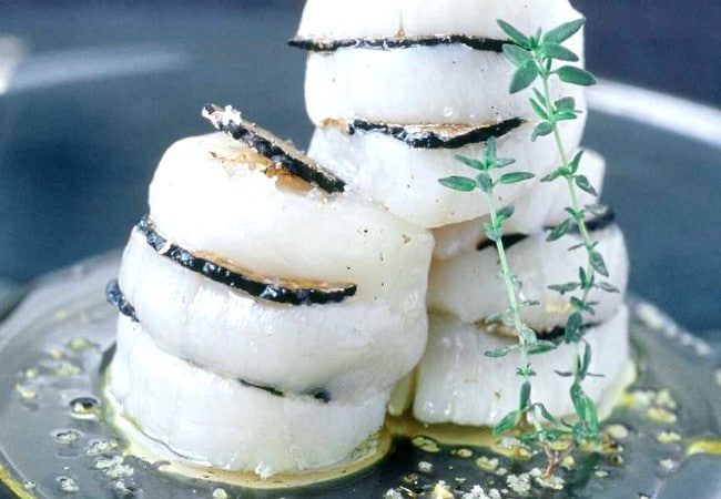 Damier de noix de Saint-Jacques crues et de lames de truffes