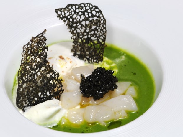 Noix de Saint-Jacques en soupe froid de laitue, crème sure et caviar Béluga