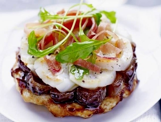Rosace de noix de Saint-Jacques snackées, échalotes et jambon cru façon tatin tiède