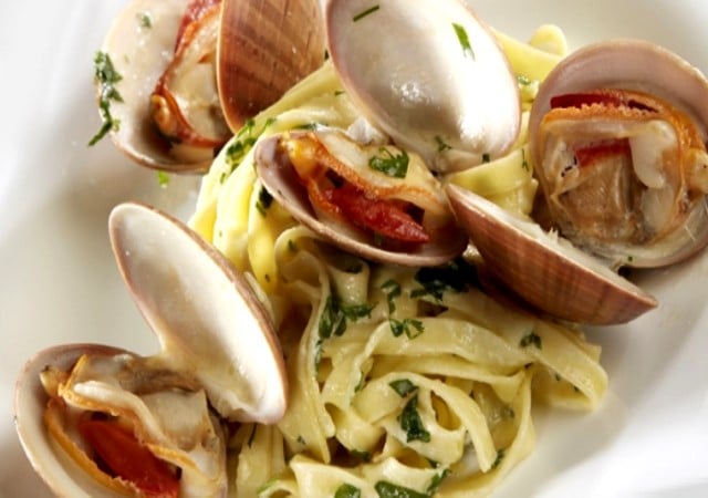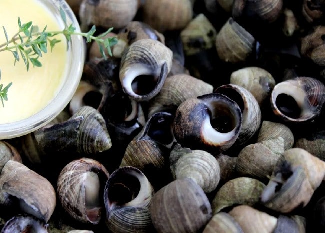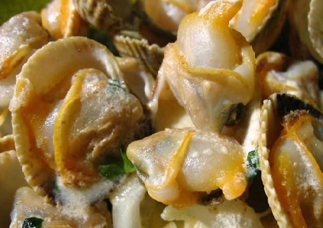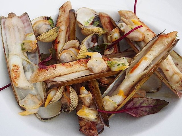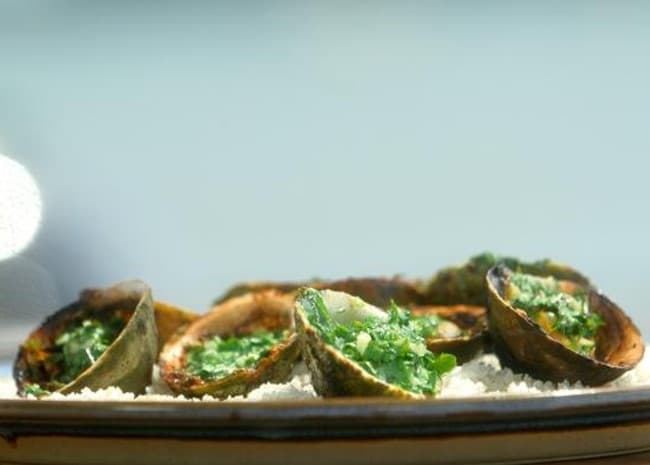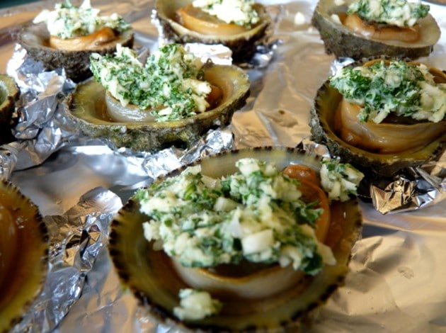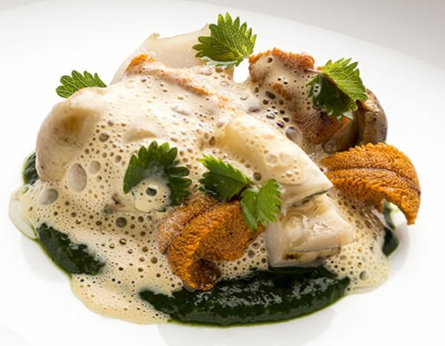 Ormeau confit au saké, cèpes et crème de cresson, émulsion de corail