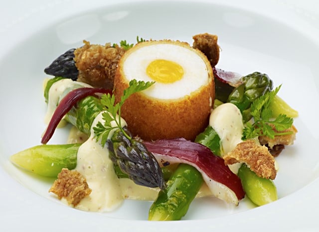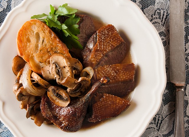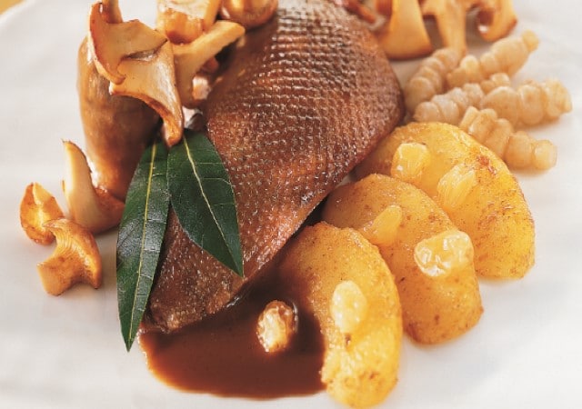 Suprême de colvert rôti aux chanterelles, crosnes et pommes dorées