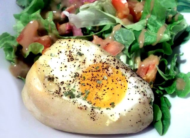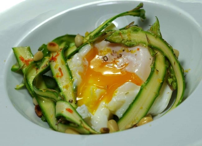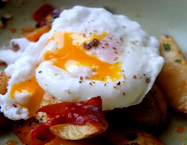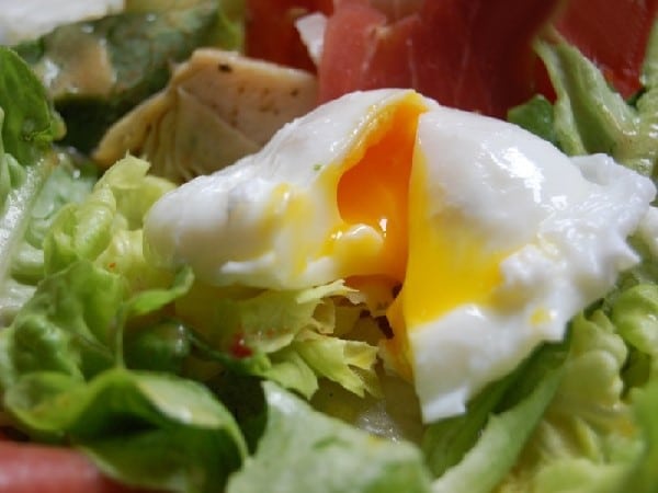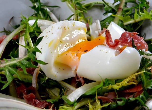 Œuf poché et salade de pissenlits à la ventrèche croustillante