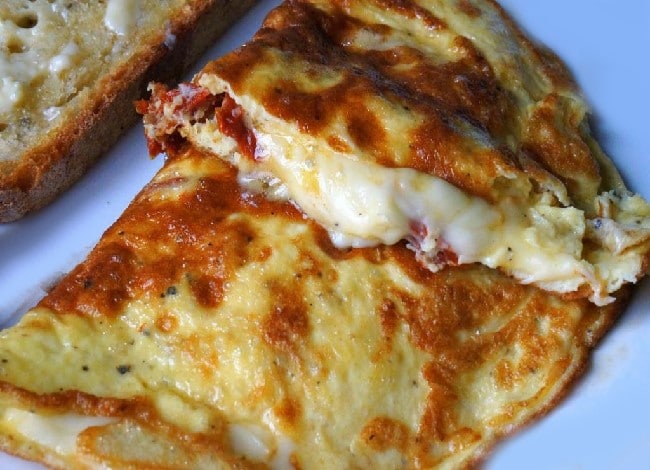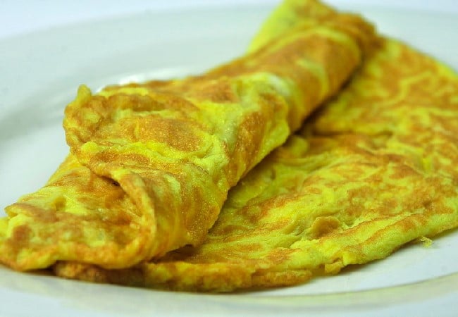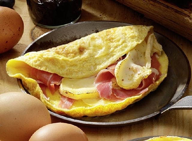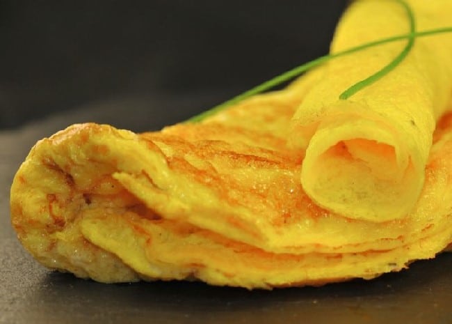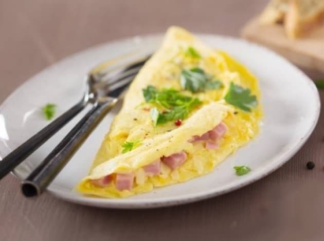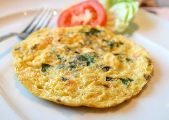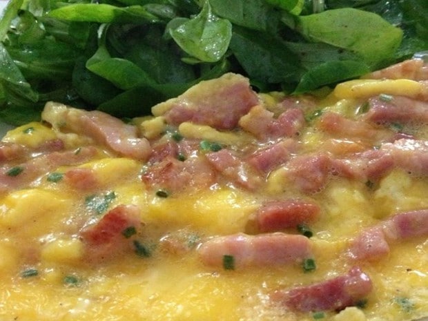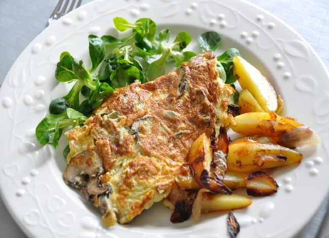 Omelette aux champignons de Paris, pommes rissolées et salade de mâche