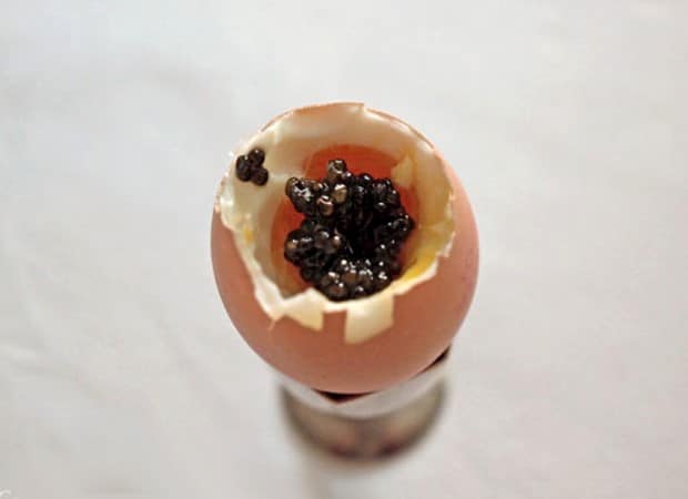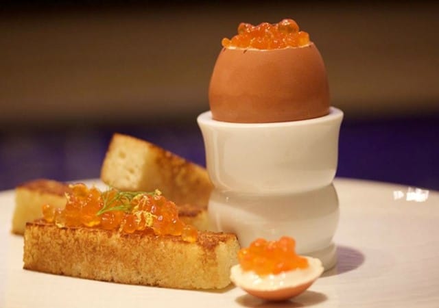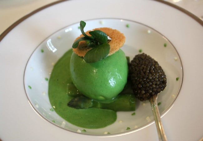 Chaud-froid d’œuf mollet aux asperges vertes, sabayon au cresson, caviar golden