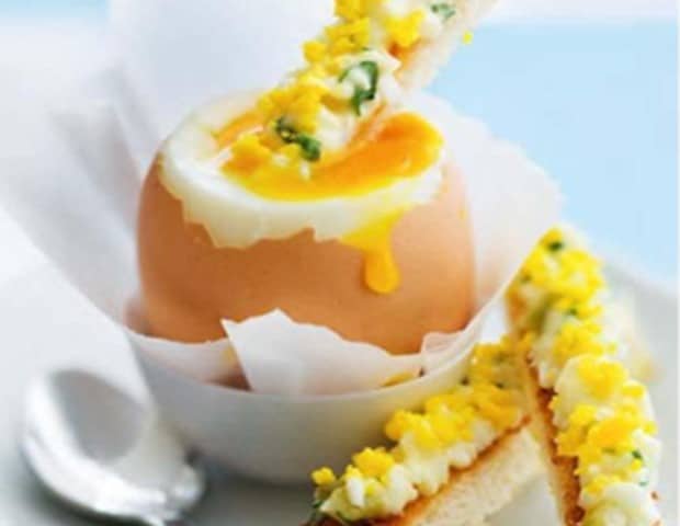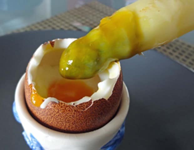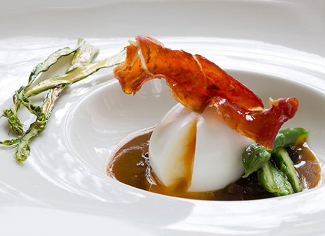Œuf mollet au jus de morilles, mouillettes d’asperges vertes et pancetta croustillante