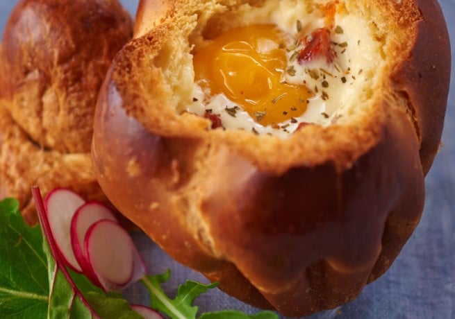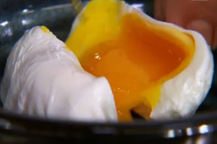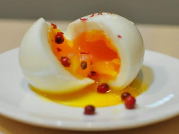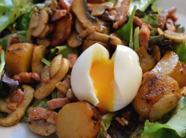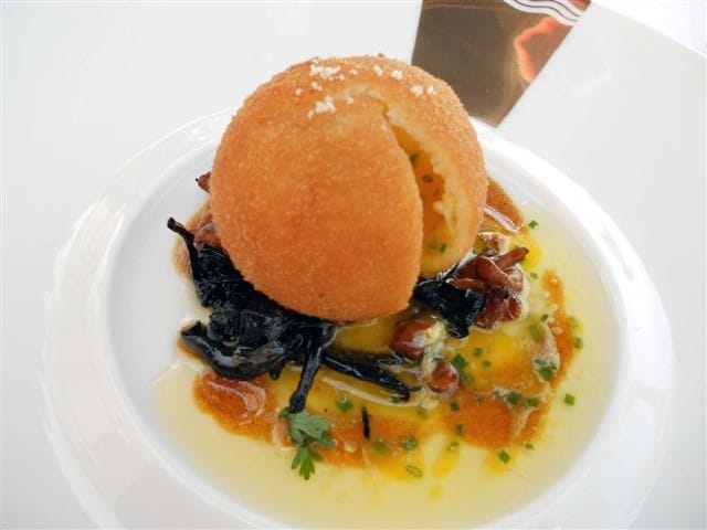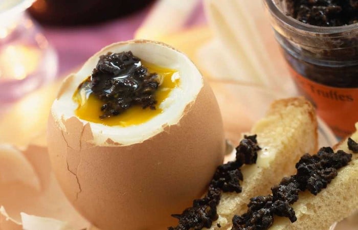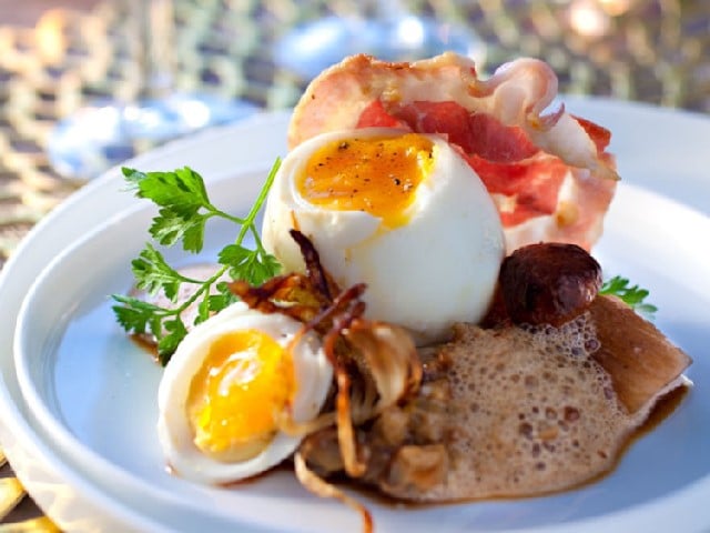 Œuf mollet aux cèpes, ventrêche crispy et émulsion au café