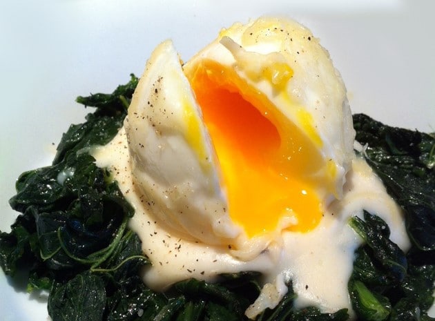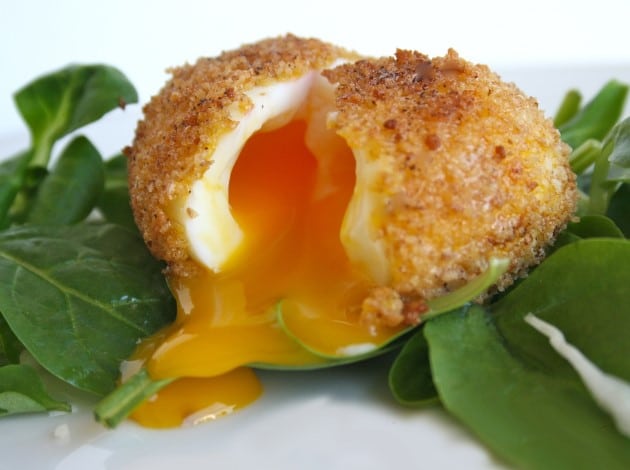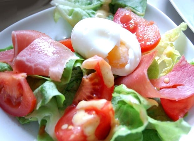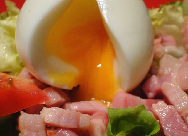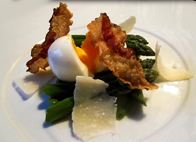 Œuf mollet aux asperges vertes, pancetta croustillante et copeaux de parmesan