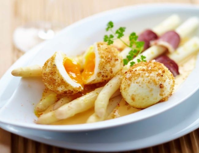 Œuf mollet en croûte, asperges blanches et lanière de magret fumé