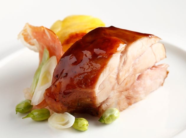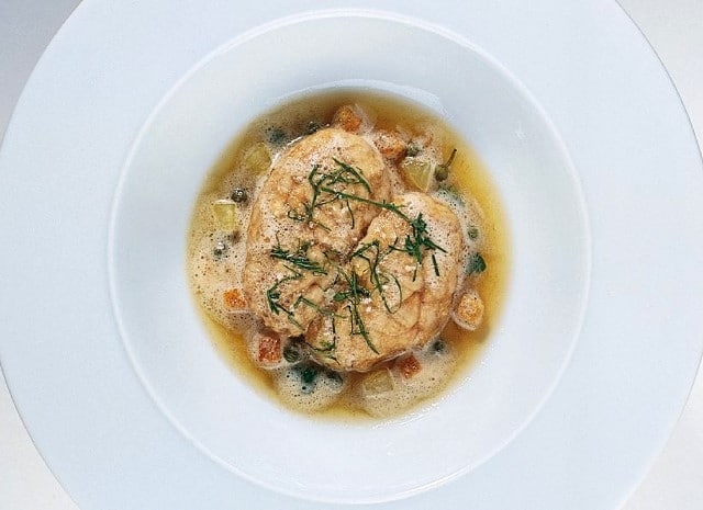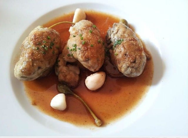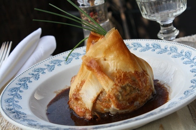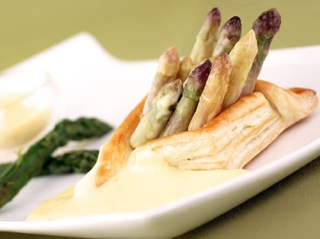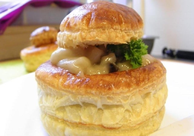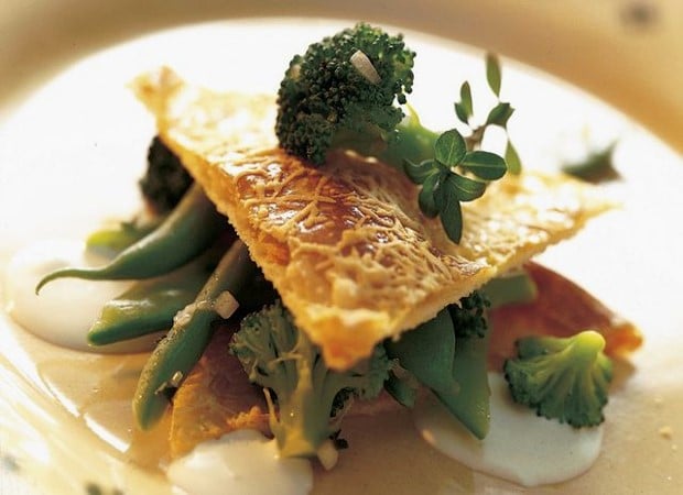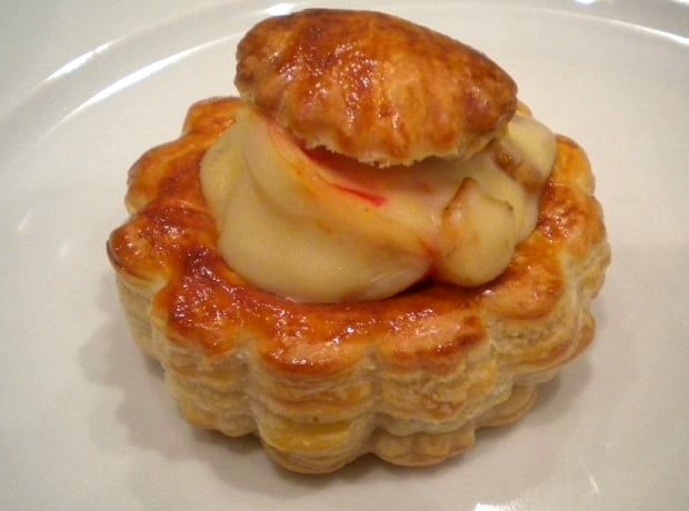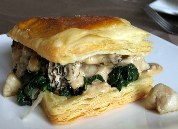 Croustade de ris de veau aux morilles et chiffonnade de pousses d’épinards
