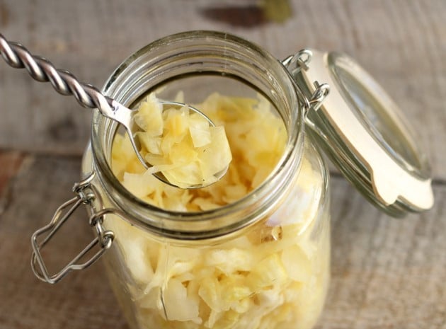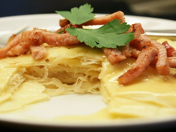 Lasagne à la choucroute, lanières de poitrine fumée et beurre moutarde