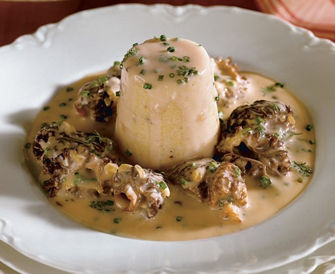 Morilles à la crème et hasty pudding