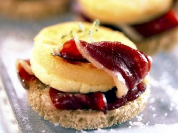 Canapé au magret de canard fumé et fromage de chèvre fondu