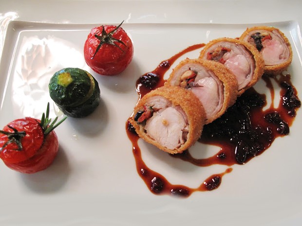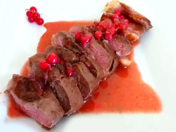 Filet de râble de lièvre pané aux amandes et jus de griottes